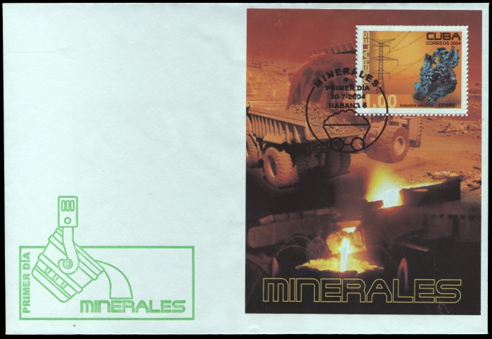 Ersttagsbrief - "Mineralien" Das Umschlagmotiv zeigt einen Schmelzkübel, der Briefmarkenblock zeigt die Beladung von Muldenkipper und den Ausfluss der Kupferschmelze. Auf der Briefmarke selbst ist eine Erzstufe von gediegenem Kupfer abgebildet, die Überlandleitung lässt den Hinweis auf Kupfer als Material für elektrische Leiter vermuten. Entwertet in Havanna, Cuba - 2004 |