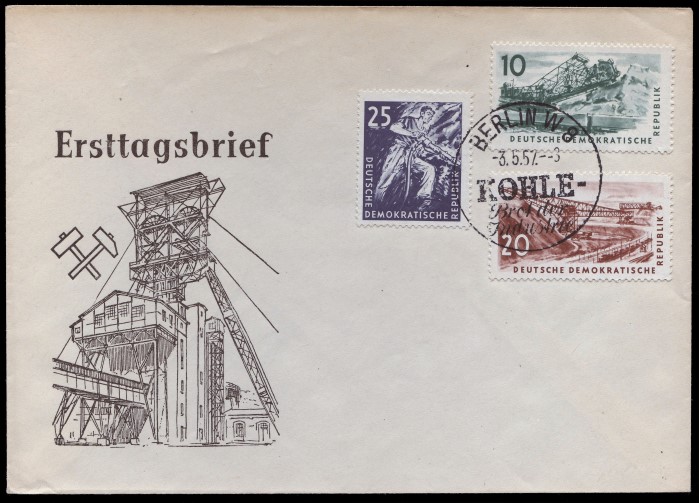 Ersttagsbrief - "Kohle - Brot der Industrie" Auf dem Briefmarkensatz sind Motive mit Maschinen aus dem Braunkohlentagebau sowie einem Bergmann mit Abbauhammer im Steinkohlenbergbau abgebildet. Das Motiv des Briefumschlages zeigt eine Schachtanlage und das Bergbauzeichen. Entwertet in Ost-Berlin, Deutsche Demokratische Republik - 1957 |