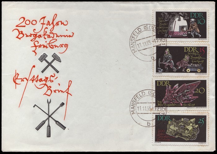 Ersttagsbrief - "200 Jahre Bergakademie Freiberg" Auf den Briefmarken abgebildet sind mittelalterliche Bergbaumotive der Erzgewinnung und Verhüttung, sowie die Mineralien Proustit und Schwefel. Den Briefumschlag zieren Schlägel & Eisen und das metallurgische Hüttenbesteck. Entwertet in Mansfeld, Deutsche Demokratische Republik - 1965 |