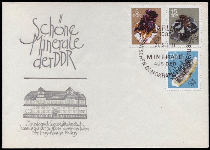 Ersttagsbrief I - "Schöne Minerale der DDR" Abgebildet sind 5 Pf Erythrin von Schneeberg/Erzgebirge, 15 Pf Galenit von Neudorf/Harz und 50 Pf Silber von Freiberg. Das Umschlagmotiv zeigt die Bergakademie Freiberg. Entwertet in Ost-Berlin, Deutsche Demokratische Republik - 1969 |