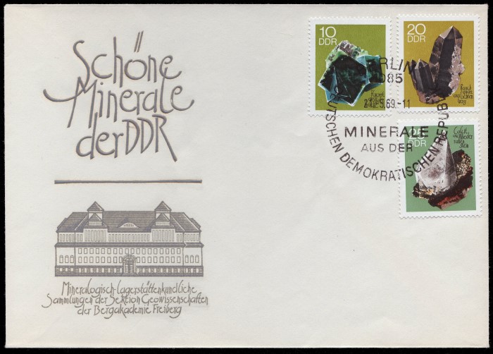 Ersttagsbrief II - "Schöne Minerale der DDR" Abgebildet sind 10 Pf Fluorit von Halsbrücke, 20 Pf Rauchquarz von Lichtenberg, 25 Pf Calcit von Niederrabenstein. Das Umschlagmotiv zeigt die Bergakademie Freiberg. Entwertet in Ost-Berlin, Deutsche Demokratische Republik - 1969 |