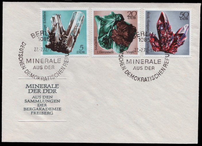 Ersttagsbrief I - "Minerale der DDR - Aus den Sammlungen der Bergakademie Freiberg" Abgebildet sind 5 Pf Gips von Eisleben, 20 Pf Malachit von Ullersreuth/Vogtland, 50 Pf Proustit von Schneeberg/Erzgebirge Entwertet in Ost-Berlin, Deutsche Demokratische Republik - 1972 |