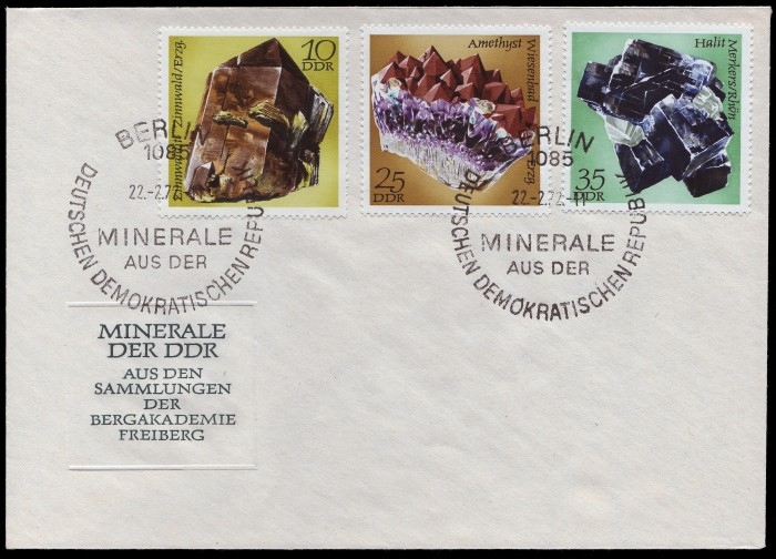 Ersttagsbrief II - "Minerale der DDR - Aus den Sammlungen der Bergakademie Freiberg" Abgebildet sind 10 Pf Zinnwaldit - Zinnwald/Erzgebirge, 25 Pf Amethyst - Wiesenbad/Erzgebirge, 35 Pf Halit - Merkers/Rhön Entwertet in Ost-Berlin, Deutsche Demokratische Republik - 1972 |