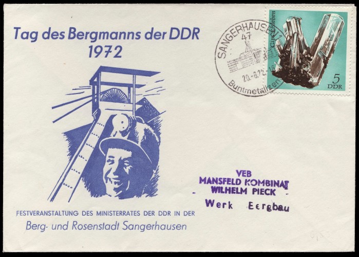 Echt gelaufener Schmuckbrief - "Tag des Bergmanns der DDR" Frankiert mit 5Pf Briefmarke, Motiv Gips von Eisleben, entwertet durch Sonderstempel mit Bergwerksanlagen und dem Hinweis auf das Buntmetallzentrum Sangerhausen. Auf dem Briefumschlag ein Motiv mit Bergmann vor dem Förderturm. Entwertet in Sangerhausen, Deutsche Demokratische Republik - 1972 |