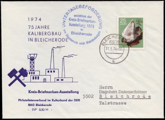Echt gelaufener regionaler Schmuckbrief zur Kreis-Briefmarkenausstellung 1974 - "75 Jahre Kalibergbau in Bleicherode" - Frankiert mit 25 Pf Briefmarke, Motiv Calcit von Niederrabenstein. Den Briefumschlag zieren Bergwerksanlagen und Bergbauzeichen. Der zusätzliche Sonderstempel hat einen Hinweis auf die Untertagebeförderung des Briefes von Bleicherode nach Kleinbodungen. Entwertet in Bleicherode, Deutsche Demokratische Republik - 1974 |
