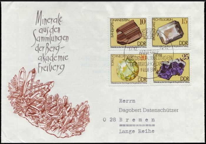 Echt gelaufener Ersttagsbrief I - "Minerale aus den Sammlungen der Bergakademie Freiberg" - Das Motiv des Briefumschlages stellt eine Quarz-Kristallstufe dar. Auf den Briefmarken abgebildet sind 10Pf Bandjaspis, Gnandstein; 15Pf Rauchquarz, Pechtelsgrün; 20Pf Topas, Schneckenstein und 25Pf Amethyst, Geyer. Entwertet in Ost-Berlin, Deutsche Demokratische Republik - 1974 |