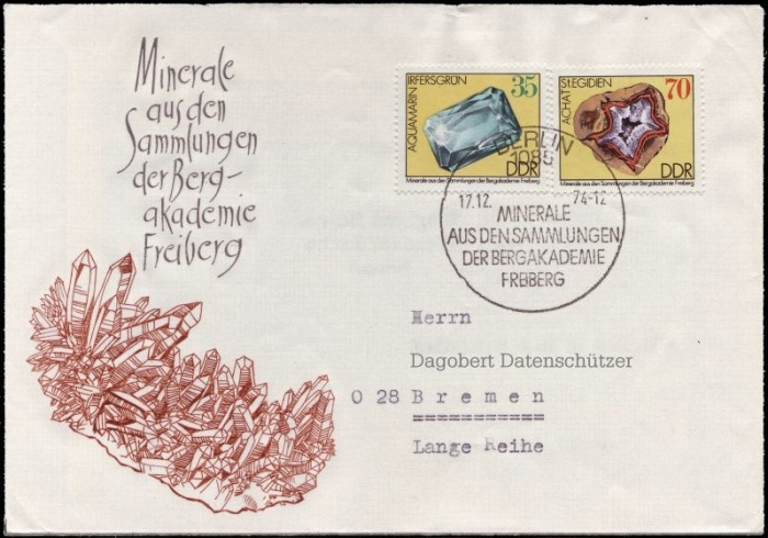 Echt gelaufener Ersttagsbrief II - "Minerale aus den Sammlungen der Bergakademie Freiberg" - Das Motiv des Briefumschlages stellt eine Quarz-Kristallstufe dar. Auf den Briefmarken abgebildet sind die Mineralien 35Pf Aquamarin, Irfersgrün und 70Pf Achat, St.Egidien. Entwertet in Ost-Berlin, Deutsche Demokratische Republik - 1974 |