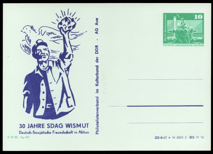 Regionale Postkarte (Ganzsache) - "30 Jahre Sowjetisch-Deutsche Aktien-Gesellschaft WISMUT" Das Motiv zeigt einen Bergmann mit einer "strahlenden" Uran-Erzstufe, dahinter eine Friedenstaube. Deutsche Demokratische Republik - 1977 |