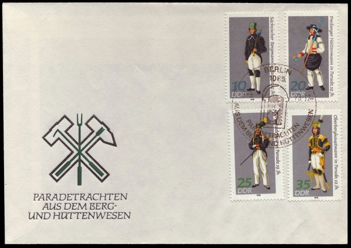 Ersttagsbrief - "Paradetrachten aus dem Berg- und Hüttenwesen des 19. Jahrhunderts" Abgebildet sind 10 Pf sächsischer Berghauptmann, 20 Pf Freiberger Hüttenmann, 25 Pf Bergakademist und 35 Pf Oberberg- hauptmann. Links über dem Schriftzug des Ausgabeanlasses befinden sich Schlägel und Eisen, sowie das metallurgische Hüttenbesteck. Entwertet wurden die Marken durch den Ersttagsstempel mit dem Motiv einer Grubenlampe (sogenannte Freiberger Blende). Entwertet in Ost-Berlin, Deutsche Demokratische Republik - 1978 |