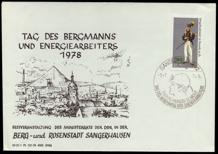 Schmuckbrief - "Tag des Bergmanns und Energiearbeiters 1978" Das Umschlagmotiv zeigt den Ort Sangerhausen, im Hintergrund die Anlagen des Kali-Bergbaus. Frankiert mit 25 Pfennig Briefmarke Bergakademist in Paradeuniform - 19.Jh. Entwertet mit Sonderstempel Bergmann mit elektrischer Kopflampe. Entwertet in Sangerhausen, Deutsche Demokratische Republik - 1978 |