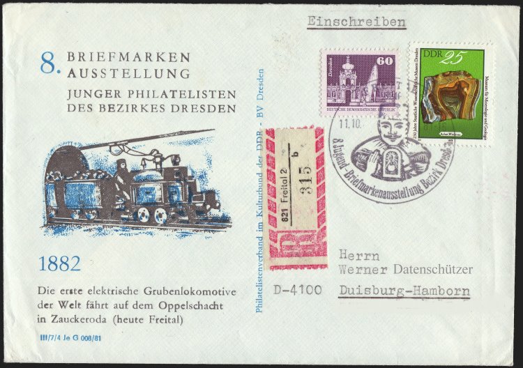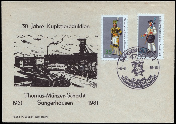 Regionaler Schmuckbrief - "30 Jahre Kupferproduktion - Thomas Münzer-Schacht Sangerhausen" Frankiert mit zwei Briefmarken des Satzes Paradetrachten aus dem Berg- und Hüttenwesens von 1978. Auf dem Briefumschlag die Anlagen des Thomas-Münzer-Schachtes. Entwertet durch einen Sonderstempel mit dem Konterfei von Thomas Münzer Entwertet in Sangerhausen, Deutsche Demokratische Republik - 1981 ![]() |