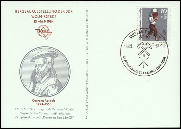 Schmuckpostkarte - “Bergbauausstellung der DDR in Wolmirstedt 1984“ Die Karte ist frankiert mit einer Marke aus dem Satz Nationale Briefmarkenausstellung, Halle. Das Motiv der Marke zeigt einen mittelalterlichen Salzträger. Der Postsonderstempel enthält Bergbausymbole. Auf dem linken Teil der Karte ist das Portrait von Georgius Agricola abgebildet, darüber das Logo des Kali-Bergbaus. Entwertet in Wolmirstedt, Deutsche Demokratische Republik - 1984 |