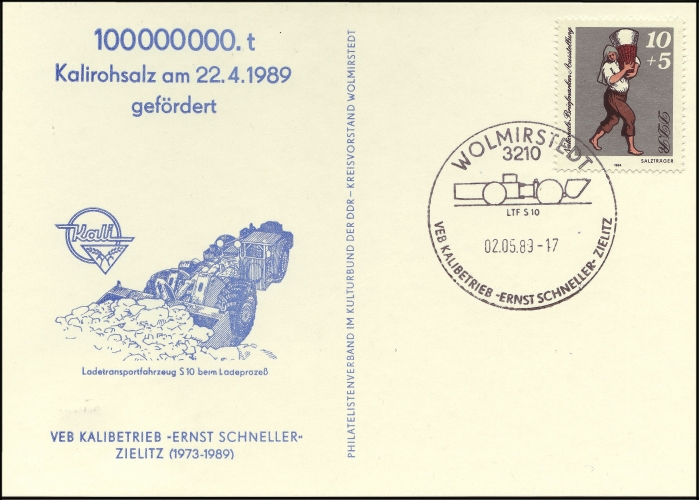 Schmuckpostkarte - “Förderung der 100 000 000. Tonne Kalirohsalz“ Die Karte ist frankiert mit einer Marke aus dem Satz Nationale Briefmarkenausstellung, Halle. Das Motiv der Marke zeigt einen mittelalterlichen Salzträger. Der Postsonderstempel enthält das Symbol eines Ladetransportfahrzeuges LTF S 10. Auf dem linken Teil der Karte ist ein solches Fahrzeug beim Laden abgebildet, daneben das Logo des Kali-Bergbaus. Im Stempel und unter dem Kartenmotiv der Hinweis auf den VEB Kalibetrieb Ernst Schneller, Zielitz Entwertet in Wolmirstedt, Deutsche Demokratische Republik - 1989 |