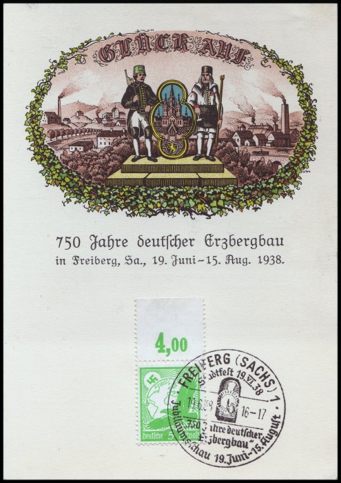 Im Hintergrund eine Ortsansicht von Freiberg, darüber der Bergmannsgruß. Die Briefmarke ist ohne Bezug zum Thema, der Postsonderstempel enthält eine Freiberger Blende.Entwertet in Freiberg, Deutschland - 1938 |