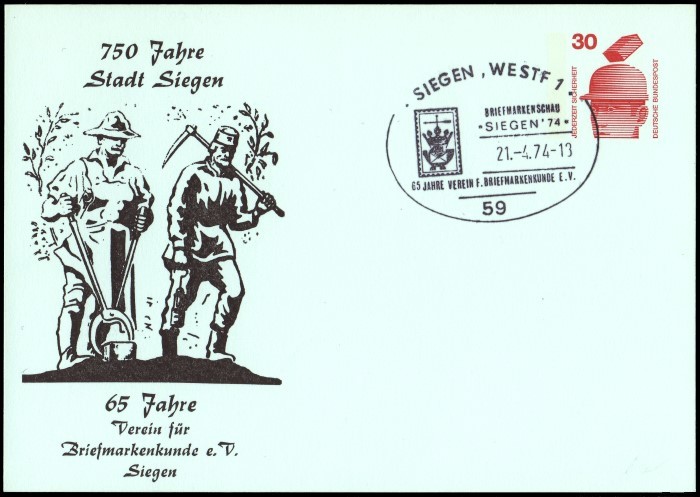 Regionale Schmuckpostkarte Verein für Briefmarkenkunde anlässlich 65 Jahre Verein für Briefmarkenkunde e.V. Siegen Das Schmuckmotiv zeigt die Siegerländer Originale Henner und Frieder. Im Postsonderstempel ist eine stilisierte Briefmarke mit dem Siegener Krönchen - Wahrzeichen der Bergbaustadt Siegen - abgebildet. Die 30 Pf Briefmarke hat keinen Bezug zum Bergbau. Entwertet in Siegen, Bundesrepublik Deutschland - 1974 |