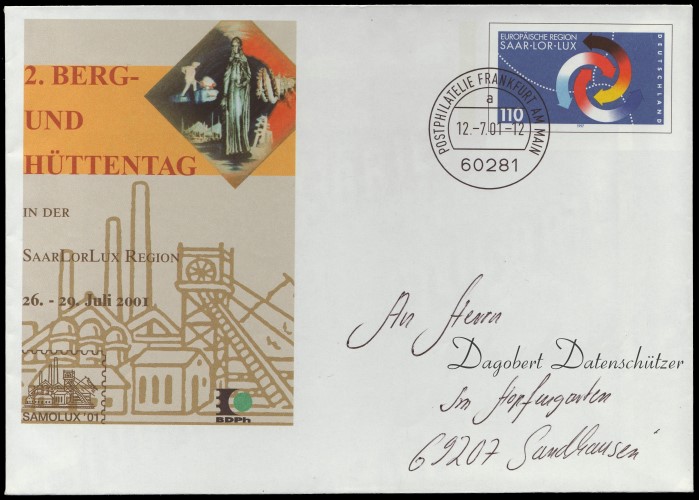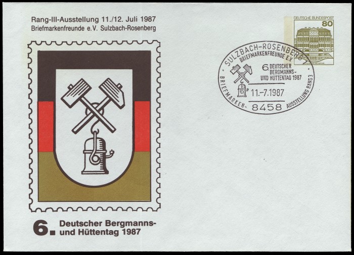 Weiterer regionaler Schmuckbrief - "6. Deutscher Bergmanns- und Hüttentag 1987" in Sulzbach-Rosenberg/Oberpfalz Das Schmuckmotiv des Briefumschlages zeigt eine stilisierte Briefmarke mit Bergbauzeichen und Grubenlampe auf schwarz-rot-goldenem Feld. Die Briefmarke (ohne bergbaulichen Bezug) ist durch einen Sonderstempel entwertet, der ebenfalls als Motiv das Bergbauzeichen und die Grubenlampe enthält. Entwertet in Sulzbach-Rosenberg, Bundesrepublik Deutschland - 1987 |