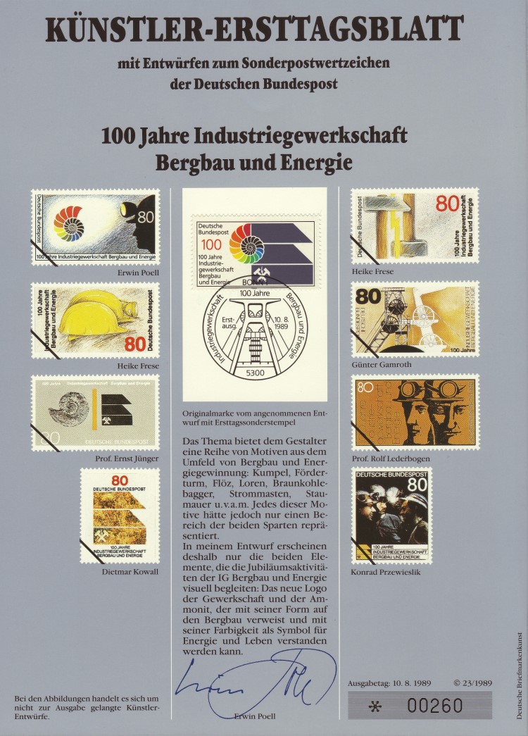 Künstler-Ersttagsblatt - "100 Jahre Industriegewerkschaft Bergbau und Energie" Abgebildet sind Entwürfe verschiedener Künstler zum Thema und die schließlich angenommene Originalbriefmarke. Entwertet in Bonn, Bundesrepublik Deutschland - 1989 |