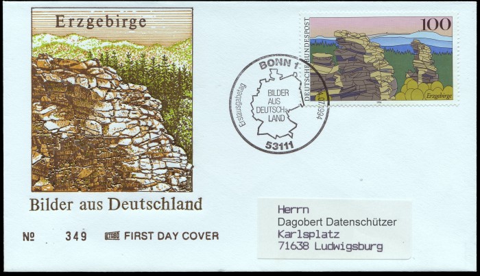 Echt gelaufener Ersttagsbrief - "Bilder aus Deutschland - Erzgebirge" Auf Briefmarke und Umschlagmotv ist eine Felsenformation des Erzgebirges abgebildet. Entwertet in Bonn, Bundesrepublik Deutschland - 1994 |