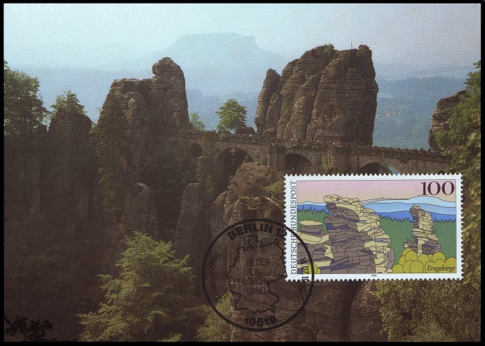 Maxikarte mit Ersttagsstempel - “Bilder aus Deutschland - Erzgebirge“ Die Maxikarte zeigt die Basteibrücke bei Rathen im Elbsandsteingebirge. Die Briefmarke aus dem Satz “Bilder aus Deutschland“ zeigt als Motiv Felsformationen aus dem Elbsandsteingebirge. Entwertet in Berlin, Bundesrepublik Deutschland - 1994 |