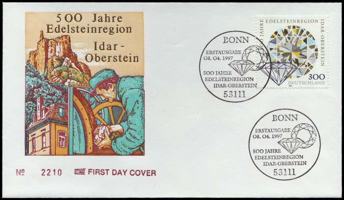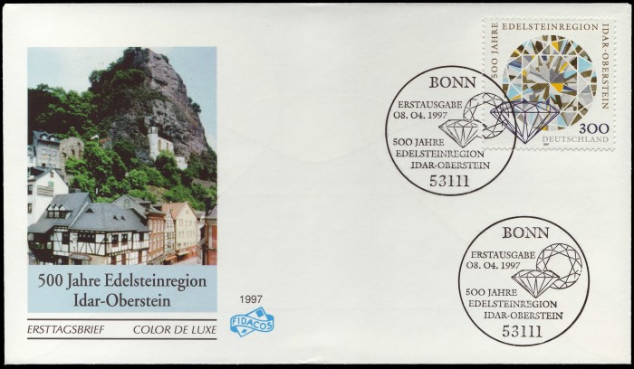Weiterer Ersttagsbrief - "500 Jahre Edelsteinregion Idar-Oberstein" Das Umschlagmotiv zeigt einen Blick auf die Altstadt von Oberstein mit der Felsenkirche. Auf der Briefmarke und im Ersttagsstempel ist ein geschliffener Diamant jeweils in Seitenansicht und Draufsicht dargestellt. Entwertet in Bonn, Bundesrepublik Deutschland - 1997 |