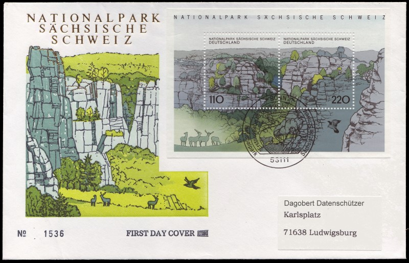 Echt gelaufener Ersttagsbrief - "Nationalpark Sächsische Schweiz" Auf dem Briefmarkenblock und dem Umschlagmotiv sind Felsformationen aus der Sächsischen Schweiz abgebildet. Entwertet in Bonn, Bundesrepublik Deutschland - 1998 |