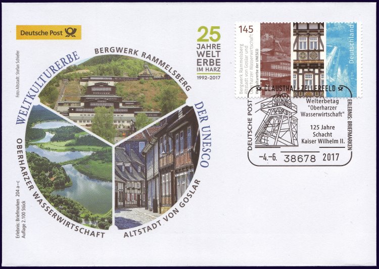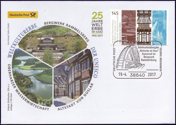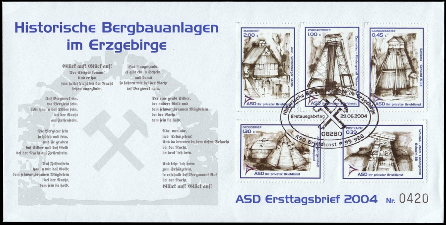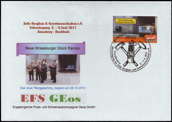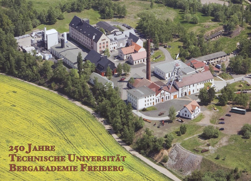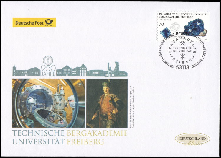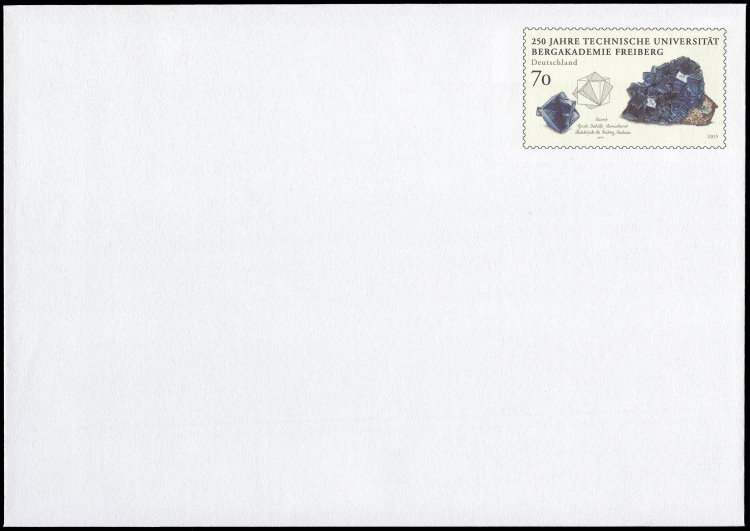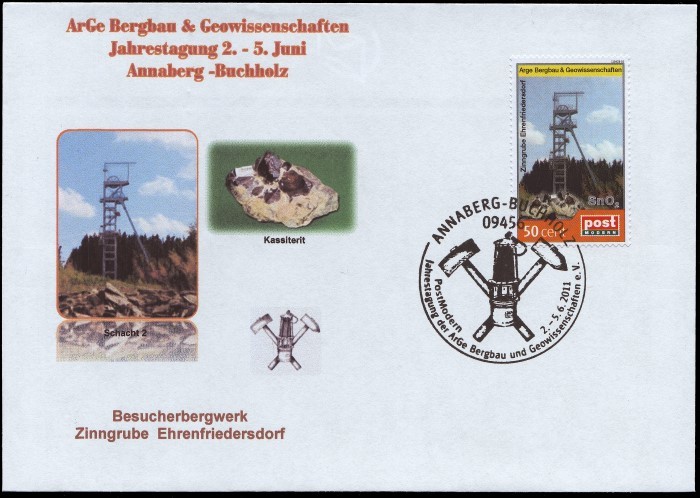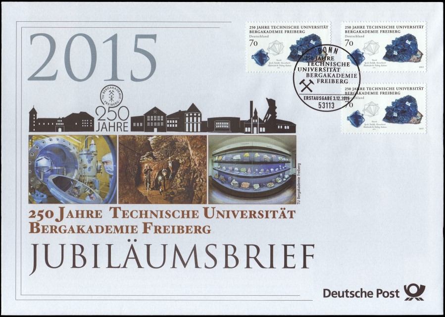 Jubiläumsbrief "250 Jahre Technische Universität Bergakademie Freiberg" Der Briefumschlag ist mit drei Werten der eigens zu diesem Anlass herausgegebenen Briefmarke frankiert. Auf den 70c Marken ist eine Fluoritstufe aus dem Samuel Spat der Grube Beihilfe bei Halsbrücke / Sachsen abgebildet. Links auf den Briefmarken sieht man einen Fluoritschwimmer als Durchwachsungs-/ Penetrationszwilling ausgebildet, sowie die entsprechende Kristallzeichnung hierzu. Auf dem Umschlag sind Motive aus dem Hochschulbereich, wie Mineralienkabinett, Lehrstollen, Forschungslabor, Gebäudesilhouette und Logo zu sehen. Der Erstverwendungsstempel enthält neben dem Ausgabeanlass und dem Ausgabedatum auch das Bergbauzeichen - Schlägel und Eisen. Entwertet in Bonn, Bundesrepublik Deutschland - 2015 Als Zugabe zum Brief wurde auch die nachstehende Postkarte, sowie ein Informationsblatt verausgabt. ![]() Die Aufnahme zeigt das Forschungs- und Lehrbergwerk "Reiche Zeche" und das Institut für Energieverfahrenstechnik und Chemieingenieurwesen ![]() in Bearbeitung ![]() Ganzsache "250 Jahre Technische Universität Bergakademie Freiberg" |
