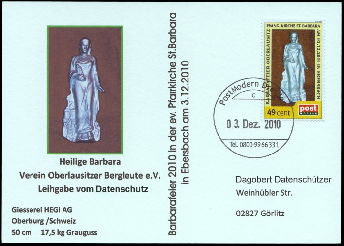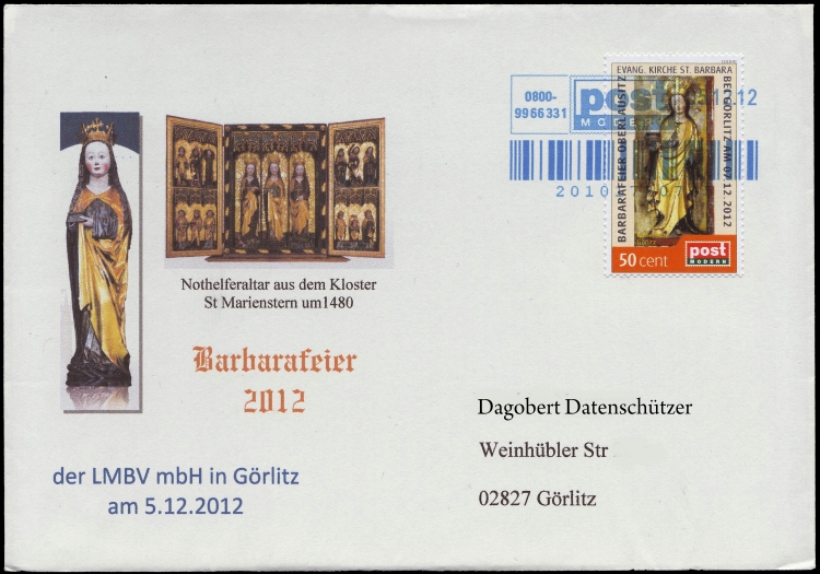 Echt gelaufener, regionaler Schmuckbrief der Lausitzer und Mitteldeutsche Bergbau-Gesellschaft mbH zur "Barbarafeier 2012" Als Motiv der 50c Briefmarke des privaten Briefdienstes PostModern, Dresden ist die Heilige Barbara, Schutzpatronin der Bergleute abgebildet. Auf dem Schmuckmotiv des Briefumschlages ist ebenfalls eine Barbarafigur (Ausschnitt aus dem Nothelferaltar des Klosters St. Marienstern) zu sehen. Bundesrepublik Deutschland - 2012 |