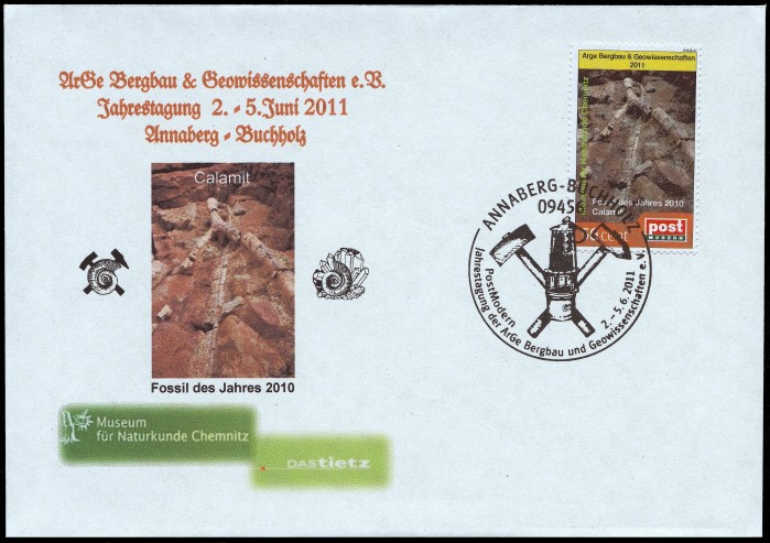 Fossil des Jahres 2010 Calamit (Schachtelhalm). Weiterhin sind auf dem Umschlag Logos der ArGe Bergbau & Geowissenschaften e.V., sowie des Museum für Naturkunde und des Kulturkaufhauses in Chemnitz aufgedruckt. Im Sonderstempel sind Schlägel & Eisen, sowie eine Grubensicherheitslampe enthalten. Entwertet in Annaberg-Buchholz, Deutschland – 2011 |