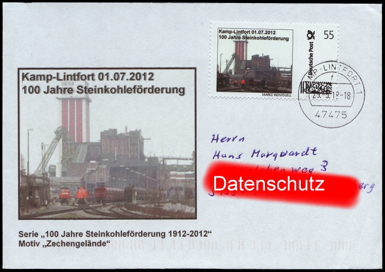 Tatsächlich gelaufener Schmuckbrief “100 Jahre Steinkohleförderung“ in Kamp-Lintfort Die personalisierte 55c Briefmarke und das Umschlagmotiv zeigen das Zechengelände des Bergwerks West in Kamp-Lintfort. Auftraggeber/Herausgeber der Marken und Briefumschläge ist der Briefmarken- und Münzsammlerverein Kamp-Lintfort von 1964 e.V. Der Schmuckbrief ist einer von insgesamt fünf zu diesem Anlass erschienenen Serie von Briefmarken/Schmuckbriefen (siehe auch unter Briefmarken, Seite C – D). Entwertet in Kamp-Lintfort, Deutschland - 2012 |