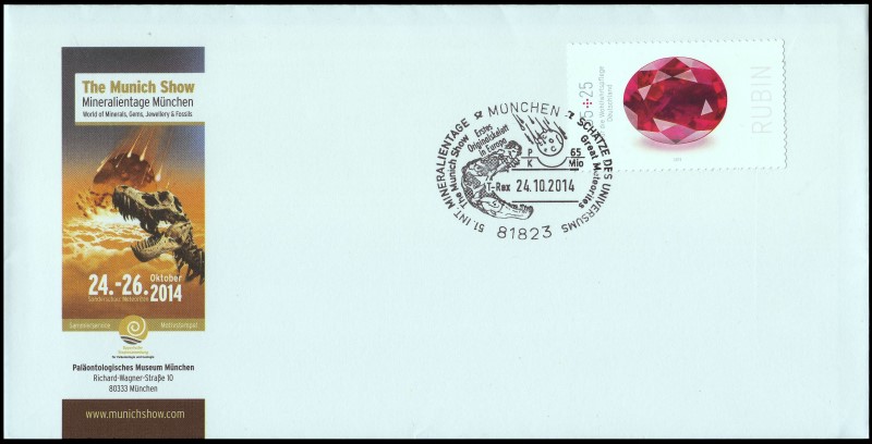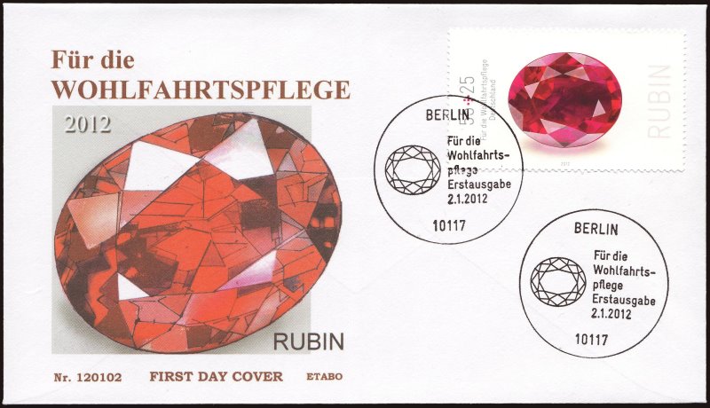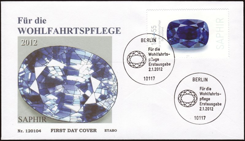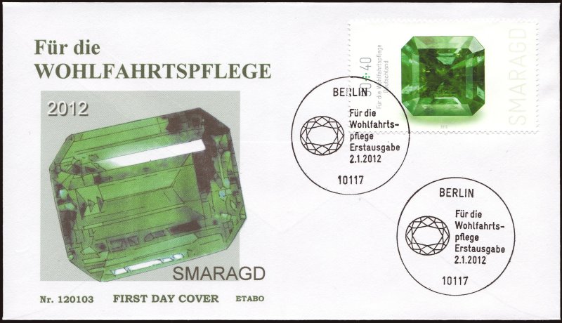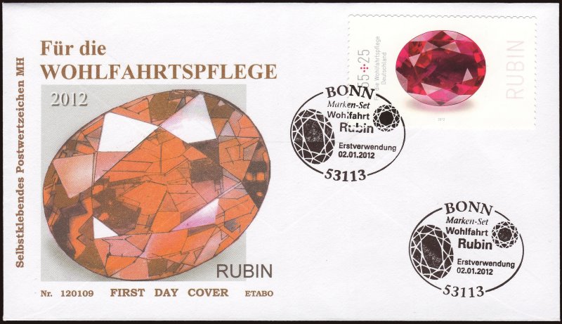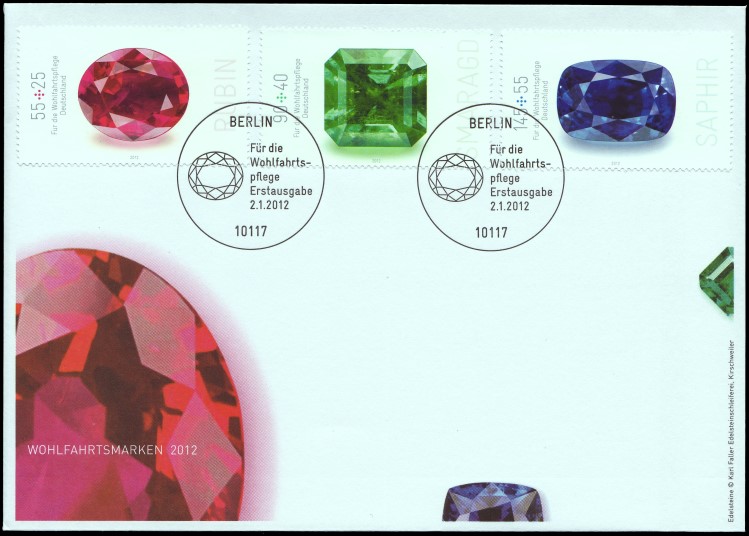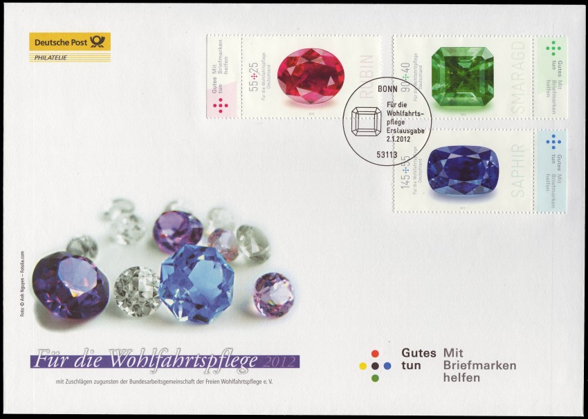 Ersttagsbrief der Deutschen Post, Ausgabe Bonn - "Für die Wohlfahrtspflege 2012" Der Briefumschlag ist mit drei Wohlfahrtsmarken frankiert, welche als Motiv die Edelsteine Rubin, Smaragd und Saphir in geschliffener Form zeigen. Das Umschlagmotiv zeigt ebenfalls eine Reihe geschliffener, aber nicht näher bezeichneter Edelsteine, des weiteren Hinweise auf die Wohlfahrtspflege. Im Ersttagsstempel ist neben dem Hinweis auf die Wohlfahrtpflege das Kristallsymbol des geschliffenen Smaragds abgebildet. Entwertet in Bonn, Bundesrepublik Deutschland - 2012 |