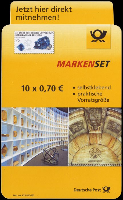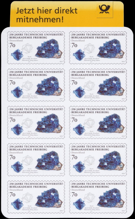 Vor- und Rückseite einer Plastik-Attrappe (Dummy) zu Werbezwecken der Deutschen Post - hier das Folienblatt 52 mit 10 x 70 Cent Selbstklebe-Marken "250 Jahre Technische Universität Bergakademie Freiberg" |