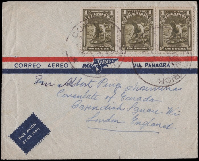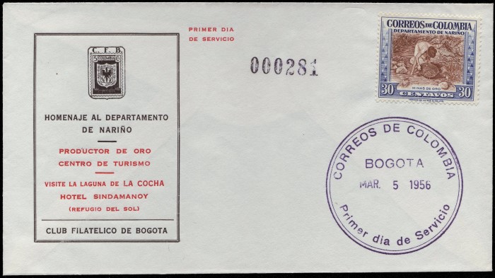 Ersttagsbrief - "Anerkennung für das Department Narino" Goldlieferant und Turistenzentrum Das Briefmarkenmotiv zeigt einen einheimischen Goldsucher mit Waschpfanne bei der Goldsuche am Fluß. Entwertet in Bogota, Kolumbien - 1956 |