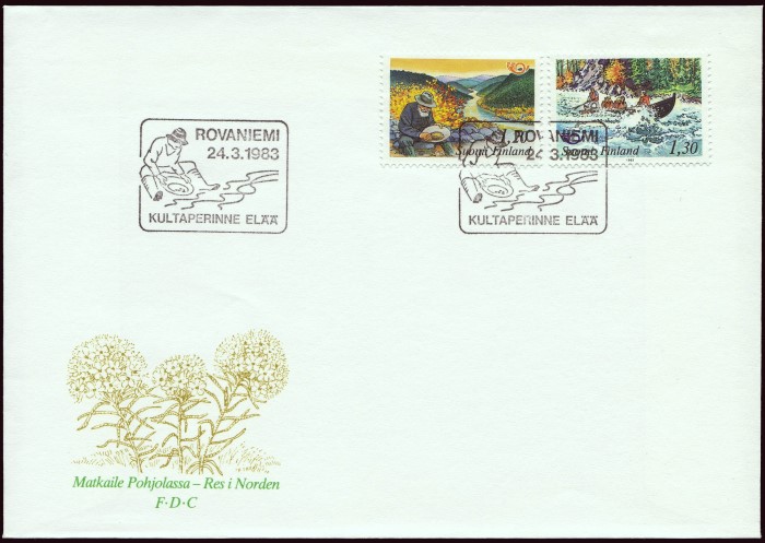 Ersttagsbrief - "Touristik in nordischen Ländern" Der Umschlag ist unter anderem frankiert mit einer Briefmarke, welche einen Goldwäscher an einem Fluß zeigt. In einem Postsonderstempel ist zu dem Slogan - Gold Tradition lebt weiter - ebenfalls ein Goldwäscher abgebildet Entwertet in Rovaniemi, Finnland - 1983 |