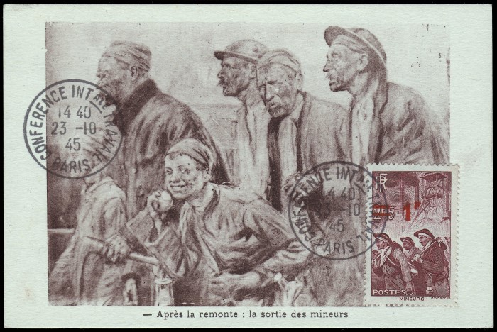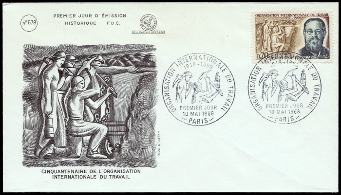 Ersttagsbrief - "50 Jahre Internationale Arbeitsorganisation" Auf der Briefmarke, im Umschlagmotiv und im Ersttagsstempel sind Bergleute bei der Arbeit untertage abgebildet. Auf der Briefmarke ist zusätzlich der damalige französische Arbeitsminister Albert Thomas zu sehen. Entwertet in Paris, Frankreich - 1969 |