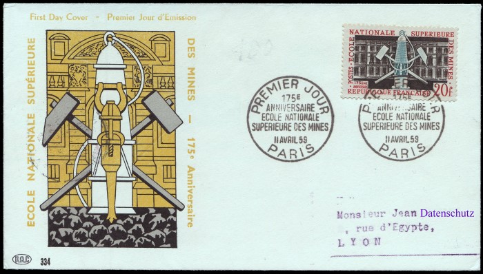 Echt gelaufener Ersttagsbrief - "150 Jahre Bergbauschule" Auf der Briefmarke und dem Umschlagmotiv sind Gebäudeteile der Schule, Bergbaulampe, Abbauhammer sowie Schlägel & Eisen abgebildet. Entwertet in Paris, Frankreich - 1959 |