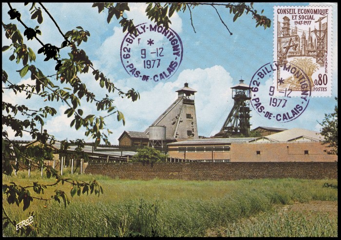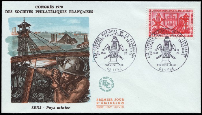 Ersttagsbrief - "Kongress der französischen Philatelisten 1970" Auf der Briefmarke sind zahlreiche Bergbausymbole wie Grubenlampe, Schlägel & Eisen, Fördertürme ect. abgebildet. Das Schmuckmotiv des Briefumschlages zeigt Übertageanlagen eines Kohlebergwerkes, sowie einen Bergmann mit Abbauhammer im Kohlenflöz. Im Ersttagsstempel sind ebenfalls eine Grubenlampe sowie Schlägel & Eisen abgebildet. Entwertet in Lenz, Frankreich 1970 Frankreich - 1970 |