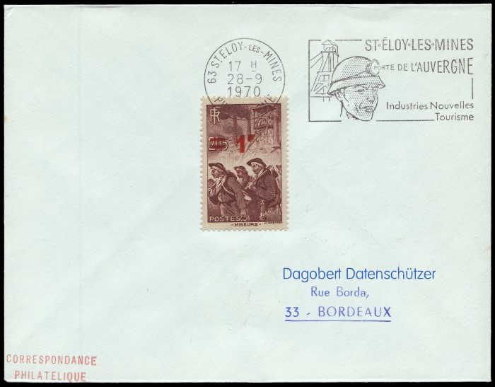 Echt gelaufener Brief aus dem Jahr 1970 Die Briefmarke aus dem Jahre 1938 zeigt Bergleute vor einer Schachtanlage. Entwertet in St. Eloy les Mines, Frankreich - 1970 |
