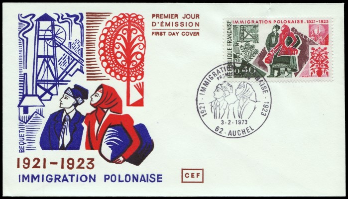 Ersttagsbrief - "Einwanderung von polnischen Flüchtlingen 1921 - 1923" Briefmarke und Schmuckmotiv des Briefumschlages zeigen ein polnisches Flüchtlingspaar, sowie Symbole aus dem Bergbau. Im Ersttagsstempel ist ebenfalls das polnische Flüchtlingspaar abgebildet. Entwertet in Auchel, Frankreich - 1973 |