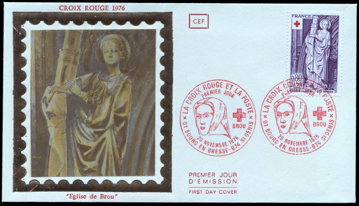 Ersttagsbrief - "Ausstellung Rotes Kreuz und Post" in Bourg en Bresse Motiv von Umschlag und Briefmarke zeigen die Heilige Barbara, Schutzpatronin der Bergleute. Entwertet in Bourg en Bresse, Frankreich - 1976 |