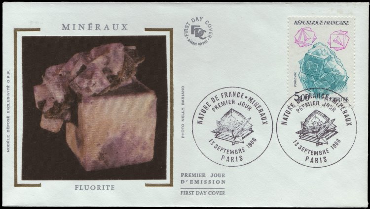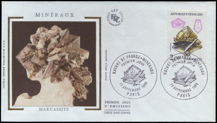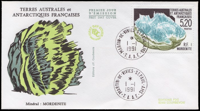 Ersttagsbrief - "Mineral Mordenit" Umschlagmotiv und Briefmarke zeigen das Zeolith-Mineral Mordenit. Entwertet in der Forschungsstation Martin de Viviès, T.A.A.F. / Frankreich - 1991 |
