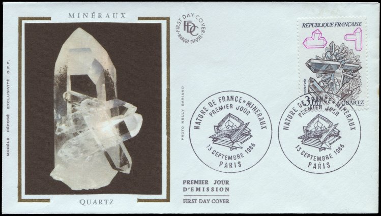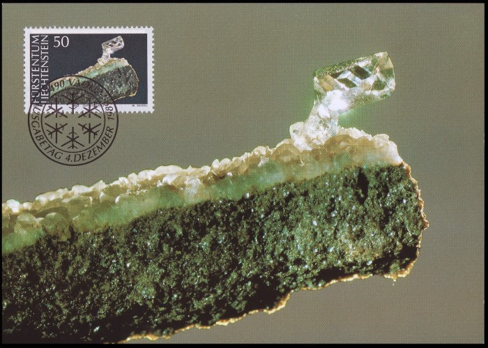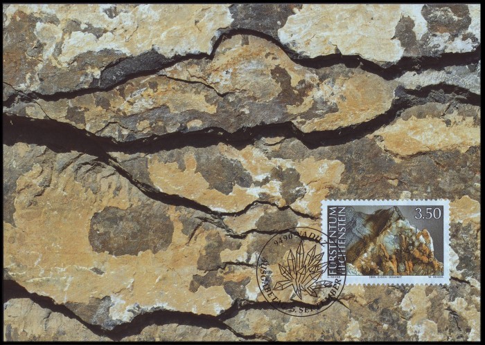 Maxikarte - Erstausgabetag - "Mineralien" Briefmarken- und Kartenmotiv zeigen einen Szepterquarz. Liechtenstein - 1989 |