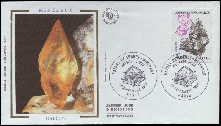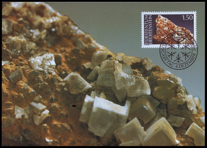 Maxikarte - Erstausgabetag - "Mineralien" Briefmarken- und Kartenmotiv zeigen Calcitkristalle. Liechtenstein - 1989 |