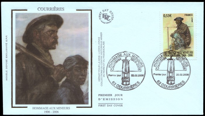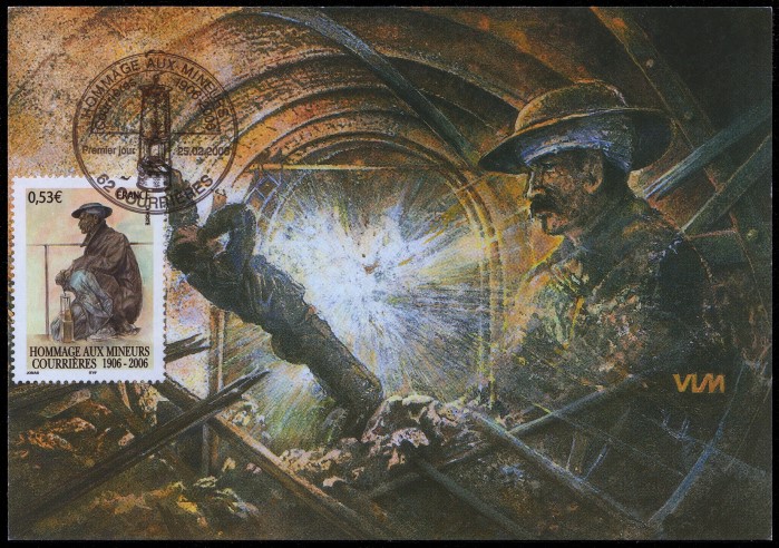 Maxikarte - "Gedenken an das Grubenunglück in Courrieres" im Jahre 1906 Das Kartenmotiv stellt die Explosion untertage dar, das Motiv der Briefmarke zeigt einen Bergmann mit einer Benzin-Sicher- heitslampe. Im Ersttagsstempel ist ebenfalls eine solche Grubenlampe abgebildet. Entwertet in Courrieres, Frankreich - 2006 |