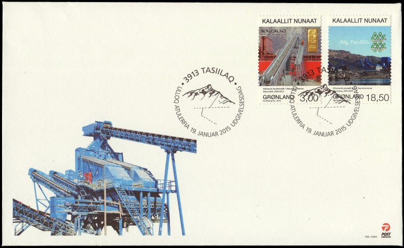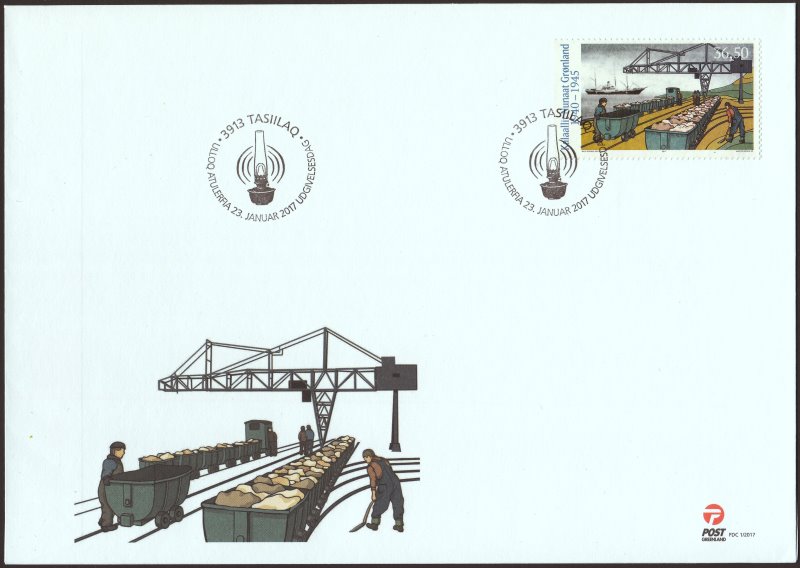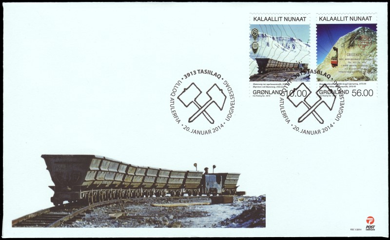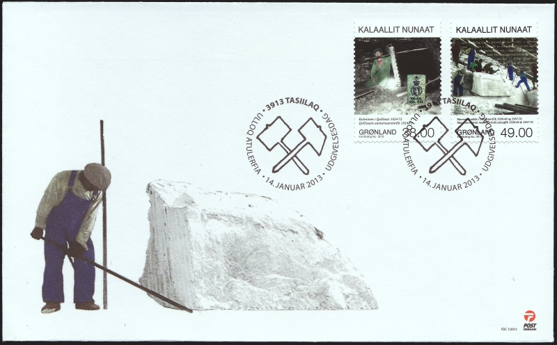 Ersttagsbrief “Bergbau in Grönland IV“ Der Brief ist mit zwei Briefmarken frankiert, welche im Motiv der 38.00 Kr Marke einen Bergmann im Kohlenbergwerk von Qullissat sowie eine Kohlenmarke zeigen, auf der 49.00 Kr Marke sind Steinbrucharbeiter beim Arbeiten an einem schweren Marmorblock im Abbau von Maarmorilik zu sehen. Auf dem Briefumschlag ist ein Arbeiter mit Marmorblock abgebildet. Im Ersttagsstempel sind Schlägel & Eisen enthalten. Entwertet in Tasilaq / Grönland 2013 |