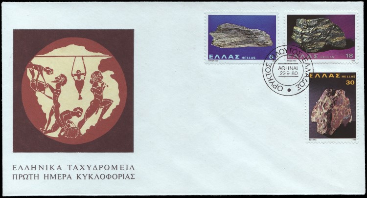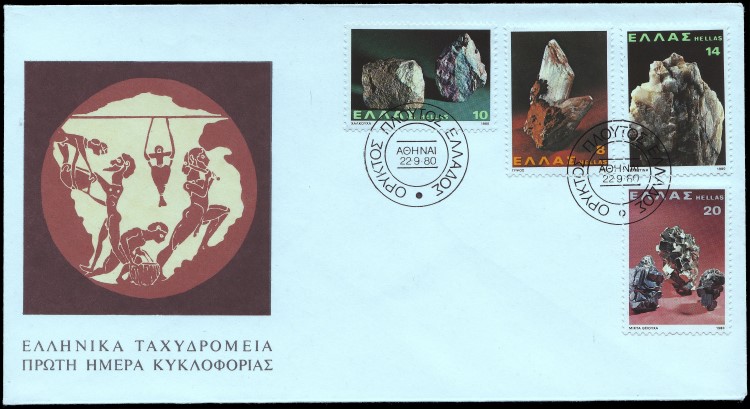 Weiterer Ersttagsbrief - “Mineralien“ Der Brief ist frankiert mit vier Briefmarken des Satzes Mineralien und zeigt Motive von Gips (3), Kupfererze (10), Baryt (14) und die Sulfide Pyrit, Galenit und Sphalerit (20). Das Motiv des Briefumschlages zeigt eine Bergbauszene aus der Antike um 600 v.Chr. Fund der Tontafel 1879 bei Penteskuphia, Korinth. Entwertet in Athen, Griechenland - 1980 |