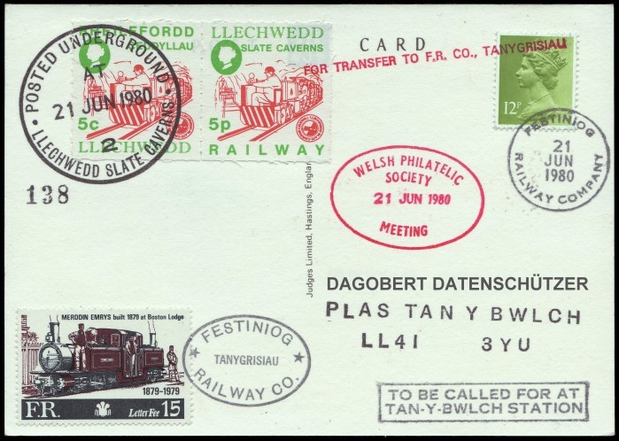 Echt gelaufene regionale Ansichtskarte aus den "Llechwedd Slate Caverns" (Schiefer-Besucherbergwerk) in Wales Frankiert mit zwei unterschiedlichen Werten der Llechwedd-Bahn mit dem Motiv einer Grubenbahn (vermutlich nur für touristische Zwecke und ohne Frankaturkraft), gleiches gilt wahrscheinlich für die Briefmarke mit dem Motiv einer alten Dampflokomotive mit Tender der Festiniog-Bahn, ursprünglich für die Schiefer-Transporte gebaut. Zwecks offizieller Postbeförderung musste die Karte dann wahrscheinlich mit der 12p Briefmarke frankiert werden. Entwertet in Tanygrisiau, Großbritannien - 1980 |