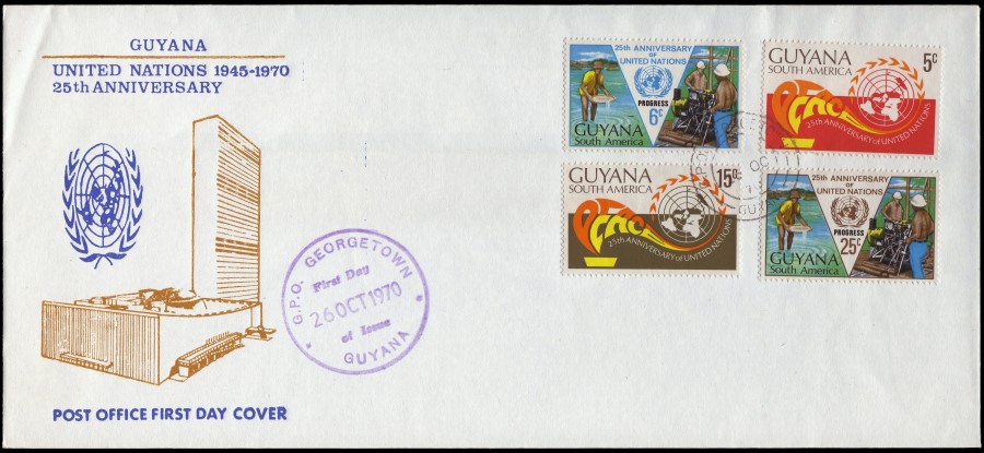 Ersttagsbrief - "25 Jahre Vereinte Nationen“ Der Brief ist unter anderem frankiert mit 6 und 25c Marken, welche einen Goldwäscher und eine Bohrmannschaft zeigen. In der Mitte das UN-Emblem. Die beiden anderen Marken des Satzes stehen, wie auch das Motiv des Briefumschlages, in keinem Zusammenhang mit dem Thema Bergbau. Entwertet in Georgetown, Guyana - 1970 |