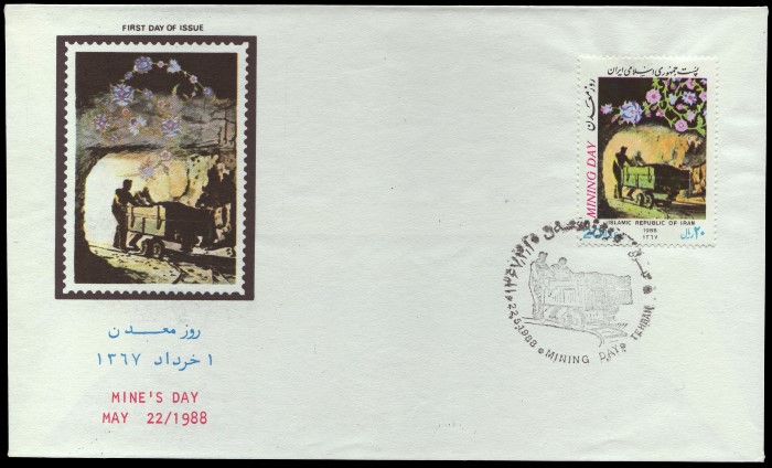 Ersttagsbrief - "Tag des Bergbaus" Auf dem Umschlag und auf der Briefmarke befindet sich das gleiche Motiv von Bergmännern, welche eine Lore schieben. Die Entwertung erfolgte durch einen Ersttagsstempel mit ähnlichem Motiv. Entwertet in Teheran, Islamische Republik Iran - 1988 |