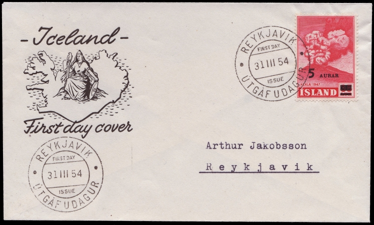 Tatsächlich gelaufener Ersttagsbrief - “Island – Ausbruch Vulkan Hekla 1947“ Der Ersttagsbrief ist mit einer überdruckten Briefmarke frankiert welche im Motiv einen Ausbruch des Vulkans Hekla im Jahre 1947 zeigt. Als Schmuckmotiv des Briefumschlages sind die Umrisse von Island mit einer Wikingerin, möglicherweise Sagengestalt oder Göttin abgebildet. Entwertet in Reykjavik, Island - 1954 |