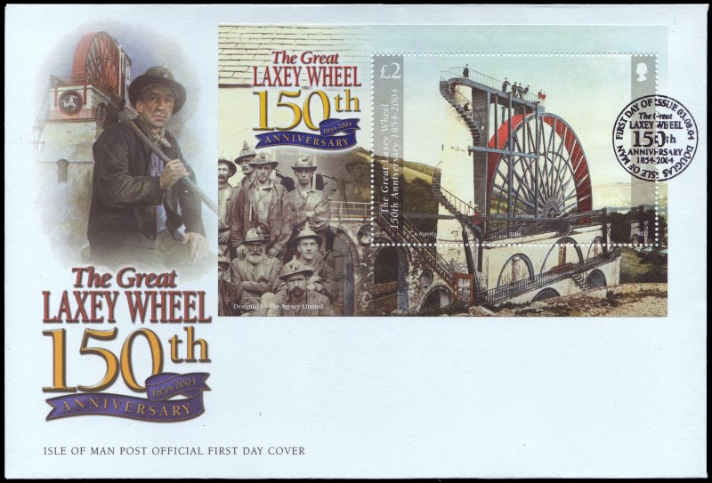 Ersttagsbrief der Insel Man - "150 Jahre Großes Wasserrad der Laxey-Mine" Auf Briefmarkenblock und Umschlagmotiv ist das große Wasserrad "Lady Isabella" der Laxey-Blei-Zink Mine zusammen mit Bergleuten abgebildet. Großbritannien / Insel Man - 2004 |